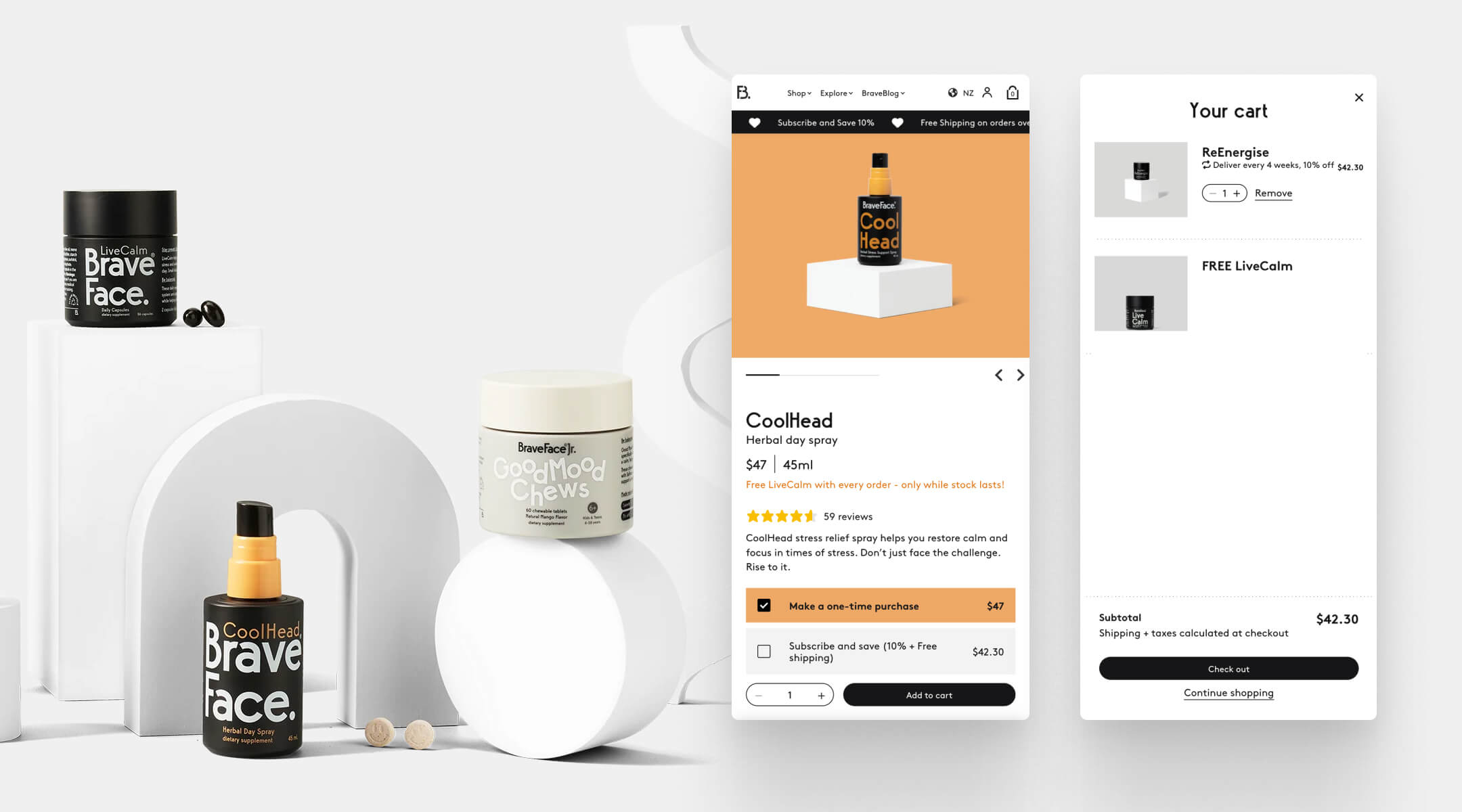 BraveFace, a consumer wellness brand from Douglas Pharmaceuticals, is changing how people approach stress. With plant-based, science-backed supplements, BraveFace helps their customers tackle daily challenges with confidence. Barrel partnered with BraveFace to launch its first ecommerce site, building a digital foundation to educate, build trust, and drive conversion.